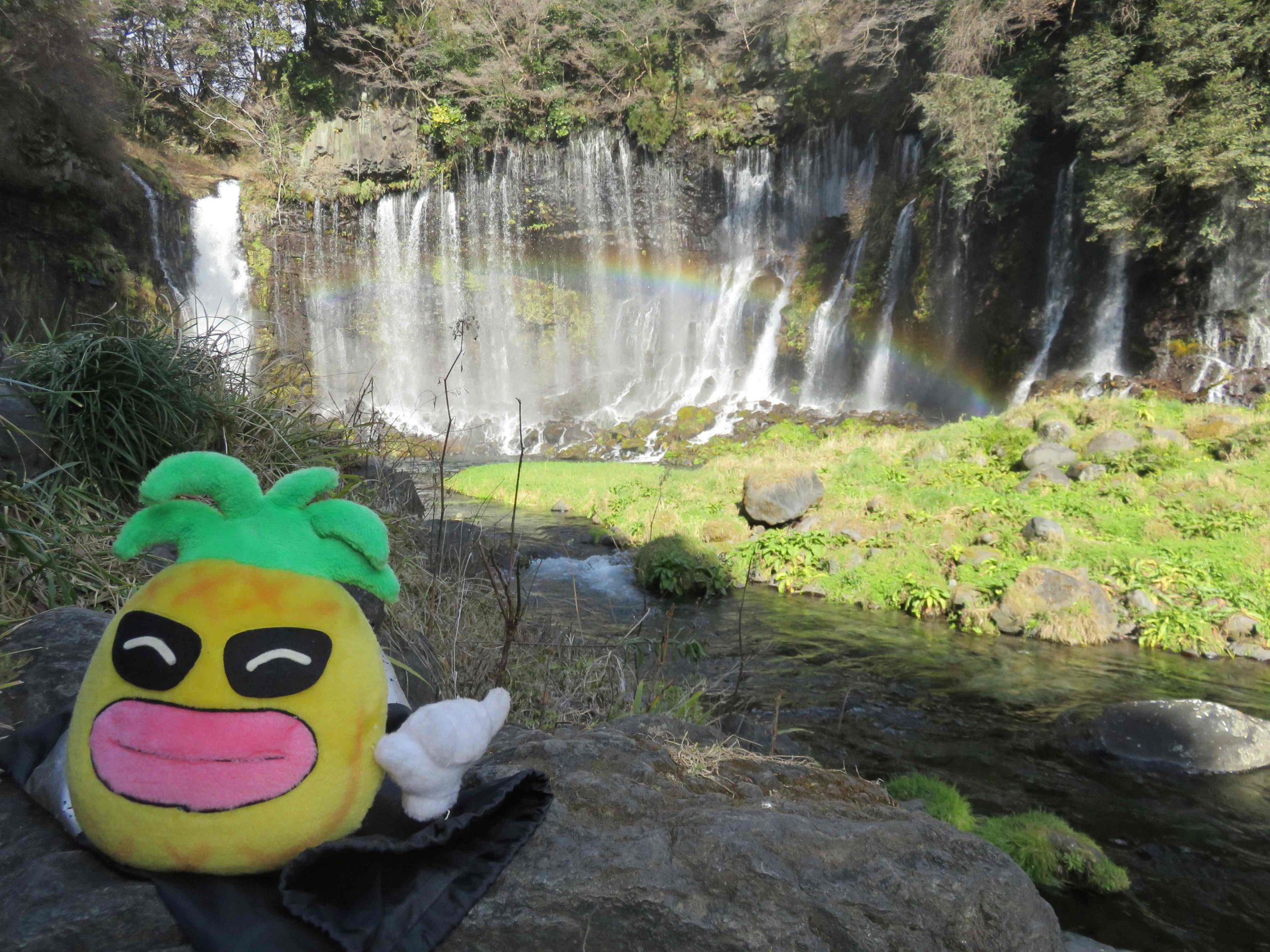 白糸の滝に、なんと虹がかかりました。幾度となくこの滝を訪れていますが、虹のかかった白糸の滝を見るのは初めてです。(2026年1月撮影)。富士宮市に来たら、ぜひとも訪れてほしいスポットです。平日にもかかわらず、来日外国人にも人気の場所になっています。