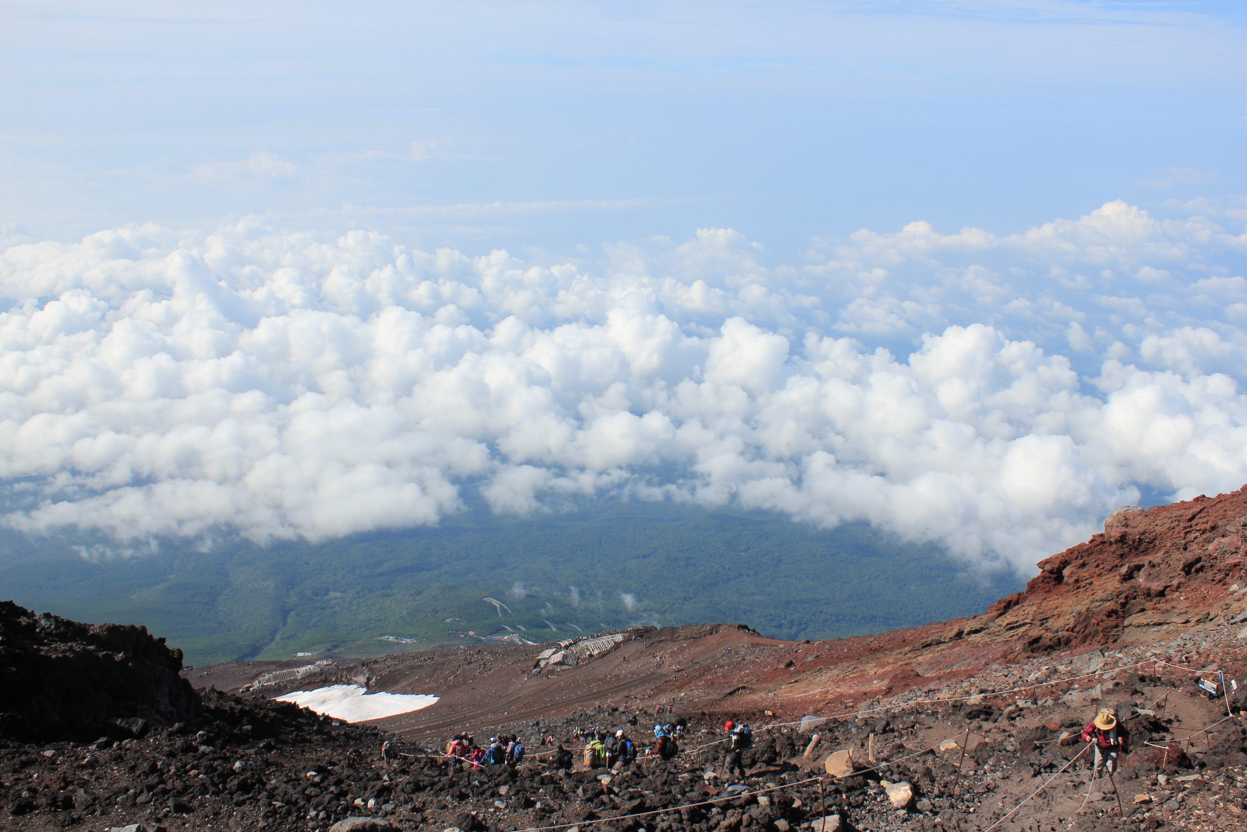 富士山頂には、最初に紹介した富士山本宮浅間大社の奥宮があります。頂上付近まで来ると、雲を下に見ることができます。雲下には「青木ヶ原樹海」が広がっています。ただ富士登山の魅力は、この景色だけではないんですよ。