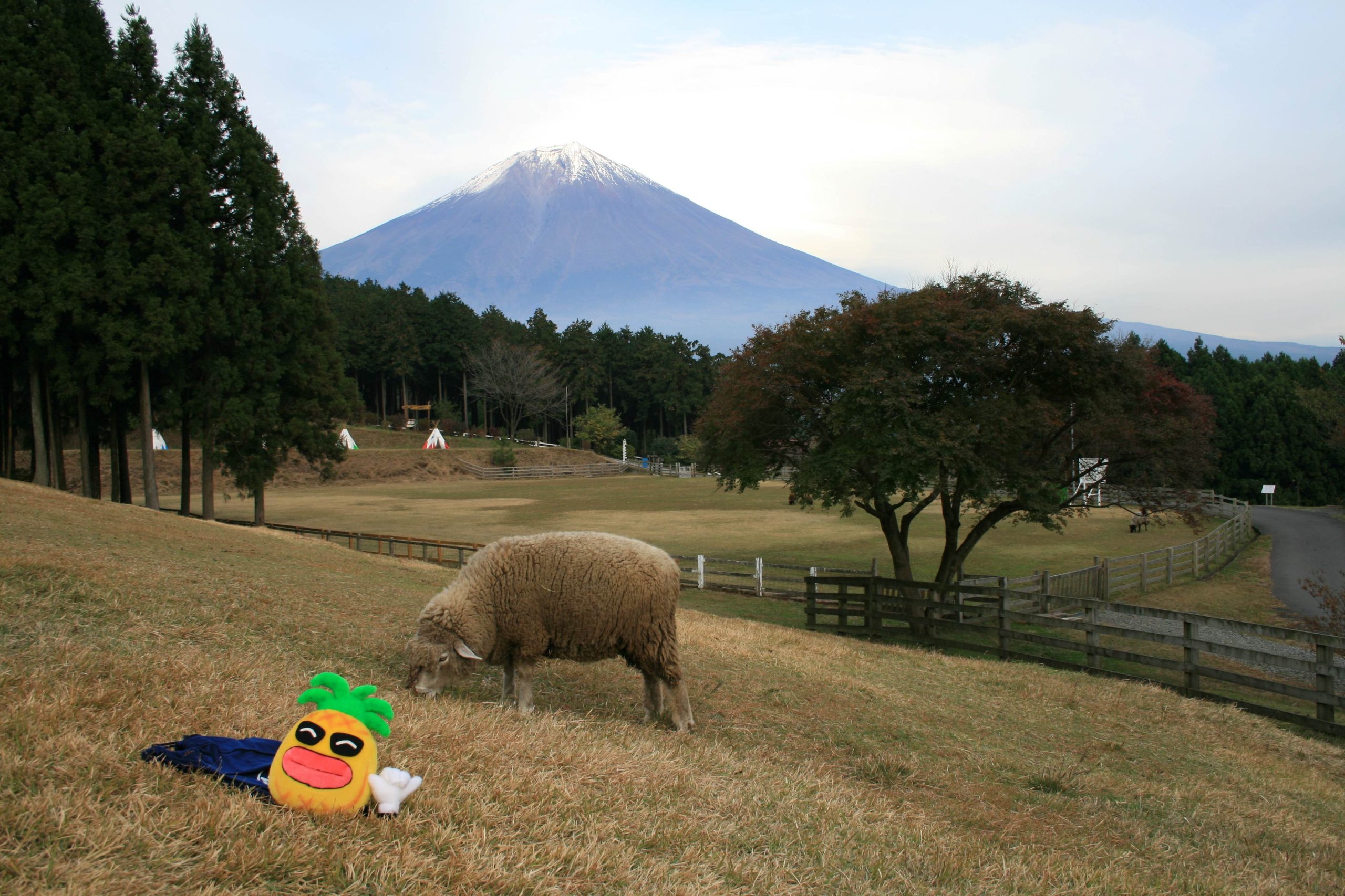 「まかいの牧場」です。昔のブログでも紹介しましたが、こちらではヤギや羊と触れ合える牧場として人気があります。富士山も雄大に見えると、美しい絵になりますね。